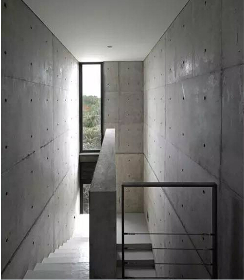 安藤的建筑一般全部或局部采用清水混凝土墻面作為室外或室內(nèi)墻面,這種墻面不加任何裝飾,墻面上的圓孔是殘留的模板螺栓。清水混凝土演奏一曲光與影的旋律。安藤在材料中攙進(jìn)了日本的傳統(tǒng)手藝,利用現(xiàn)代的外墻修補(bǔ)技術(shù),將水泥墻面拆掉模板后進(jìn)行處理,他將混凝土運(yùn)用到了高度精煉的層次。在清水混凝土的施工中,傳統(tǒng)手工藝和現(xiàn)代建筑之間并不矛盾,高超的木模制造工藝、優(yōu)越的混凝土鑄造以及嚴(yán)格的工程管理,共同造就了“安氏混凝土美學(xué)”。