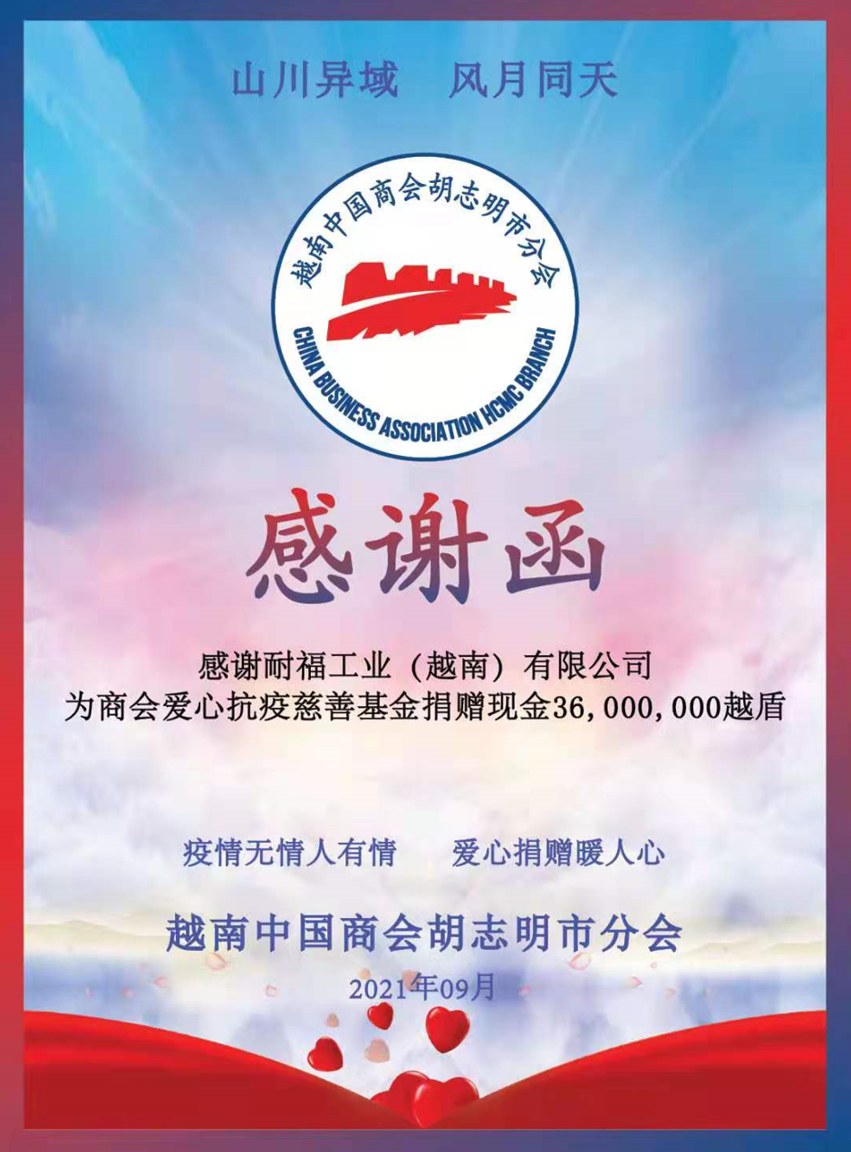 耐福工業(yè)(越南 )有限公司是耐福地坪在越南的分支機構(gòu),在時間,公司積極響應(yīng)商會倡議,捐款36,000,000 越南盾(折合10,000 RMB),貢獻了一份綿薄之力。錢雖少,情更深,作為在越中資企業(yè),我們在這里經(jīng)商,也需要在特殊的時刻,與越南人民同艱苦,共患難,互相幫助,體現(xiàn)我們中華名族的傳統(tǒng)美德。